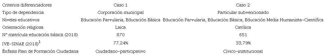Los casos a analizar están conformados por dos establecimientos educacionales ubicados en la comuna de Antofagasta, Chile, los cuales formaron parte del proceso de acompañamiento en la elaboración e implementación del Plan de Formación Ciudadana iniciado en el año 2016. Se trata de establecimientos educacionales que cuentan con características diferenciadoras entre sí, de las cuales se han considerado: tipo de dependencia, niveles educativos impartidos, orientación religiosa, número de matrícula de educación básica, Índice de Vulnerabilidad y, finalmente, el énfasis diferenciado en cuanto a la formación ciudadana que promueven (Tabla 2).