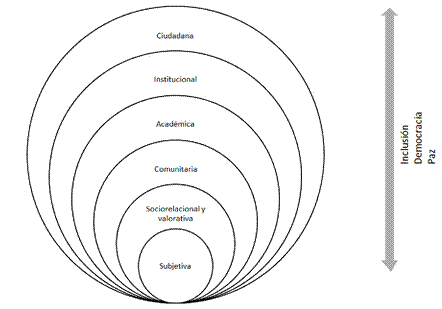 En este sentido, retomando las propuestas de Booth y Ainscow (2004), Fierro y Tapia (2012), Chaparro y Caso (2012) en relación con la convivencia inclusiva; las propuestas de Fierro, Carbajal y Martínez-Parente (2010) acerca de la convivencia democrática y las propuestas de la UNESCO (2008) de la convivencia pacífica, asumimos que para poder comprender y generar acciones en el campo universitario para lograr una convivencia adecuada es necesario impactar en todas las dimensiones de interacción persona-institución universitaria. Para ello, consideramos indispensable iniciar el trabajo desde lo personal, para posteriormente ir ampliando y profundizando en las relaciones cercanas, las comunitarias, las académicas y las institucionales, como se ilustra en la figura 1, la cual sustenta la necesidad de contemplar que para el avance en el campo de la convivencia universitaria con impacto en la convivencia ciudadana se requiere de procesos reflexivos subjetivos que impacten las relaciones sociales cara a cara, para que posteriormente, este impacto pueda ampliarse al espacio comunitario universitario, a la labor e interacción académica, a la propia institución y finalmente a la sociedad en general, mediante una convivencia ciudadana participativa y comprometida con el bien común. Lo anterior implica, no sólo contemplar los diferentes acercamientos propuestos por Fierro-Evans y Carbajal-Padilla (2019) para comprender la convivencia en la literatura Latinoamérica, sino también, considerar la inclusión, la democracia y la paz como ejes transversales a toda labor en las diferentes dimensiones. Sin duda, creemos que el poder avanzar en este campo requiere de un trabajo interconectado entre las diferentes dimensiones, pues éstas dependen unas de las otras y, por lo tanto, se requiere de procesos de construcción colectiva y una fuerte dosis de compromiso con las mismas.