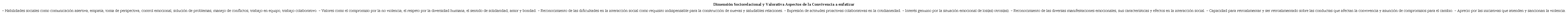 La dimensión sociorelacional y valorativa abarca las habilidades sociales y los valores personales que se ponen en juego en las relaciones e interacciones que una persona integrante de la comunidad universitaria establece en su entorno cercano e inmediato. En esta dimensión al ser relaciones cara a cara, la influencia de una persona a otra es bidireccional y, por tanto, es más fuerte y de mayor impacto. Trabajar esta dimensión sociorelacional y valorativa implica comprometerse con el desarrollo de diferentes aspectos de la convivencia como los que se proponen en la Tabla 2.