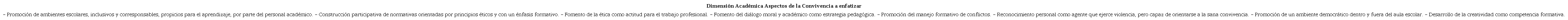 La dimensión académica se refiere al compromiso del personal académico, en primera instancia, pero también al compromiso por parte de la comunidad estudiantil para favorecer la construcción de conocimientos en ambientes promotores de una convivencia social que aporte al crecimiento personal y social. Trabajar esta dimensión académica implica comprometerse con el desarrollo de diferentes aspectos de la convivencia como los que se proponen en la Tabla 4.