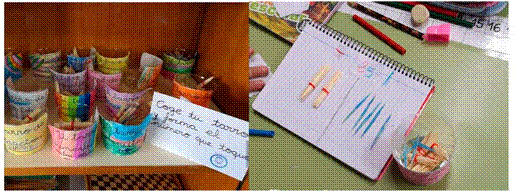 Cada alumno tiene un tarro de numeración propio personalizado y etiquetado con su nombre, que contiene nueve unidades sueltas (9 palitos pintados de azul) junto a 9 decenas (9 agrupaciones de 10 palitos rodeados por una goma roja). Para favorecer la localización y orden de los materiales, se estableció un espacio en el aula exclusivo para su almacenaje. Estos tarros se utilizan para la representación de aquellos números que el docente extraiga de la caja de los números, que oscilan del 1 al 99.
