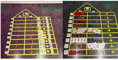 En la zona de asamblea, hay dibujado en el suelo con cinta adhesiva de colores la estructura de una casa de nueve plantas y una buhardilla, en la que se pueden diferenciar cuatro bloques o espacios de trabajo, que serán empleados por los alumnos para indicar el número convencional, número de decenas, número de unidades y composición del número por medio de la suma de conjuntos. En primer lugar, se ubican en orden, del piso más alto al bajo, los números que han sido seleccionados. Al lado de cada número, en su mismo piso, se realizan las operaciones anteriormente indicadas con el sistema de palitos, y conforme se familiarizan con la intervención se pueden contemplar la utilización de otros materiales de representación que contengan diferentes colores, tamaños o diseños (tapones de botellas, cartas, etc.). Cada semana se trabaja una secuencia de números del 0 al 100.