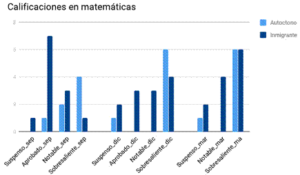Se puede observar que, para el alumnado inmigrante se produce un crecimiento sustancial en las calificaciones, aumentando el número de sobresalientes de un alumno a seis, mientras que las calificaciones en los autóctonos se mantiene sin modificaciones sustanciales. Los resultados del contraste de medias mediante la U Mann-Whitney sólo evidenciaron diferencias significativas en la relación entre la nacionalidad y las calificaciones de septiembre (U = 14.500, p > .014).