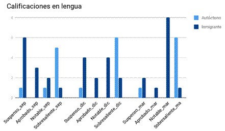 En cuanto a las calificaciones obtenidas en el estándar de aprendizaje referido al lenguaje y expresión oral en base a la variable predictora inmigración, se han obtenido una relación entre significativa ambas, de modo que los estudiantes autóctonos obtienen mejores puntuaciones en mayor medida que los inmigrantes (Figura 7). Específicamente, las significaciones se han hallado entre la inmigración y las calificaciones de septiembre (χ2(4) de Pearson = 8.870, p < .031; V de Cramer = .683, p < .031), con una magnitud del efecto elevado (rYλ = .68) (Rosenthal, 1991); entre la inmigración y las calificaciones de diciembre (χ2(4) de Pearson = 9.115, p < .028; V de Cramer = .693, p < .028), con una magnitud del efecto elevado (rYλ = .69); y finalmente, entre la inmigración y las calificaciones de marzo (χ2(4) de Pearson = 12.451, p < .006; V de Cramer = .810, p < .006), con una magnitud del efecto muy alto (rYλ = .810) (Rosenthal, 1991). Así mismo, en el contraste de media a través la U Mann-Whitney se han obtenido valores de significación inferiores a 0,05, constatando la relación significativa entre inmigración y calificaciones en expresión y comprensión oral en septiembre (U = 13.500, p > .012), en diciembre (U = 16.000, p > .020) y en marzo (U = 14.000, p > .011).
