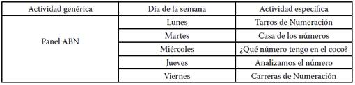 La metodología del ABN permite una adquisición natural y manipulativa de los números de manera que contribuya a flexibilizar el pensamiento matemático, esencial para la construcción de contenidos matemáticos de mayor envergadura. De esta manera, se utilizarán varios recursos que hagan visible el concepto matemático y, por lo tanto, ayude a la abstracción del mismo desde un contexto funcional y cercano escenificado desde la asamblea. De esta manera, a modo de rutina, se elabora un itinerario didáctico representado para realizar durante la primera media hora de cada día de la semana durante los meses de octubre a febrero. Comienza con una parte genérica, común a todos los días, desde el uso de un panel de ABN matemático de rutinas acerca de la fecha, número de asistentes o la situación meteorológica. Posteriormente, se ejecuta una parte específica que, para evitar la monotonía y repetición, cada día es se centra en una actividad diferente que acota el contenido de la numeración desde varias perspectivas. Para cerrar la actividad, a modo de reflexión y sumario, se procede a una puesta común de cinco minutos en la que repasar lo abordado y comentar los aspectos más destacables. Aunque se muestre como un esquema fijo, las actividades presentan la posibilidad de ser graduadas y ampliadas a fin de atender a las diferentes necesidades y ritmos de aprendizaje. En la siguiente tabla queda plasmada la temporalización semanal a realizar durante dos meses.