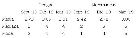 En esta investigación se ha recabado información cuantitativa y cualitativa. En primer lugar, se procede exponer en la Tabla 3, que muestra los descriptores globales de aula, tanto en lengua como en matemáticas, para cada uno de los momentos que se ha realizado la evaluación: septiembre, diciembre y marzo.
