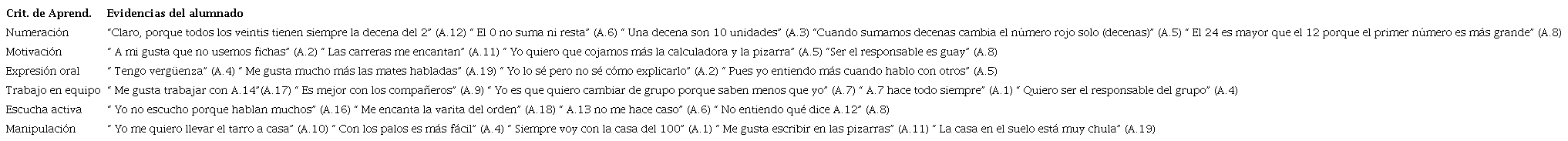 Respecto al último criterio de evaluación, la manipulación, queda patente que, a primera vista, cualquier escenario didáctico que salga de los libros de texto denota un interés y curiosidad que incita al aprendizaje (Alsina, 2016). Los materiales no sólo resultan llamativos, sino que también se articulan para los alumnos como elemento de referencia para el apoyo y representación de la adquisición de la numeración, objeto de soporte que ayudan a figurar los contenidos de numeración desde un contexto en el que los sentidos juegan un papel primordial. De esta forma, se evidencia la mejora de los aprendizajes, pues desde el uso de los recursos manipulativos, se establece un puente de la lógica matemática a la realidad (Gallegos y Feijoó, 2017).