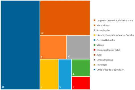 Área de la educación según el Ministerio de Educación de Chile (MINEDUC): dentro de las cuales encontraremos: a) Artes visuales, b) Ciencias naturales, c) Educación física y salud, d) Historia, geografía y ciencias sociales, e) Ingles, f) Lengua indígena, g) Lenguaje, comunicación y literatura, h) Matemáticas, i) Música, j) Orientación, k) Religión y l) Tecnología, m) otro tipo.