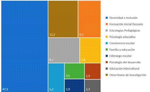 En la figura 2 se observan los tópicos de investigación desarrollados en los últimos diez años en las carreras de educación. Se evidencia que las principales áreas son diversidad e inclusión (47,1%), formación inicial docente (9,3%) y estrategias pedagógicas (8,7%).