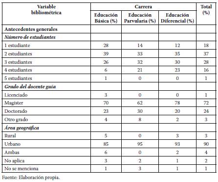 En los antecedentes generales se analizaron 383 tesis de pregrado, el 37%, fueron realizadas por dos estudiantes, mientras que solo el 1% fue realizada por 5 estudiantes. En relación con el grado académico del docente guía de las tesis analizadas, el 72% contaba con el grado de magíster y el 24% con el grado de doctor. En relación al área geográfica, el 90% de las tesis fueron realizadas en zonas urbanas, mientras que el 3% fueron realizadas en zonas rurales (Tabla 1).