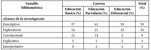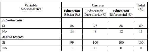 Resumen: Uno de los hitos más significativos en la formación inicial docente relacionado con las habilidades investigativas es el proceso de tesis. Por ello, en este estudio se propone identificar las características estructurales y metodológicas de las tesis de pregrado de las carreras de Educación Básica, Educación Parvularia y Educación Diferencial de una Escuela de Educación en una universidad chilena. Bajo una metodología cuantitativa de corte retrospectivo, se extrajeron indicadores bibliométricos de 383 tesis de las carreras mencionadas entre los años 2010 y 2019, utilizando un formulario pre-pilotado. Los resultados mostraron que existe un alto cumplimiento en los aspectos de estructura de las tesis, no obstante, la sección de discusión presenta debilidades. Con todo, las tesis incorporan aspectos formales en la estructura, lo que ha permitido desarrollar indagaciones científicas bien organizadas. Sin embargo, se sugiere profundizar en las herramientas metodológicas para implementar y conducir las investigaciones hacia aspectos de reflexión pedagógica.
