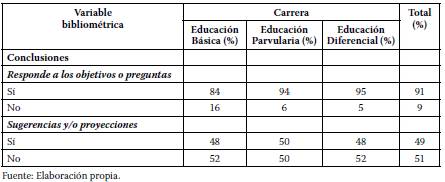 Respecto de las conclusiones, los valores son similares entre las tres carreras, por lo que el 91% de las tesis responde a los objetivos y/o preguntas de investigación y un 49% de las tesis presentaron sugerencias y /o proyecciones al finalizar la tesis (Tabla 5).