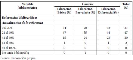 Son las fuentes primarias utilizadas para elaborar los diversos capítulos de las tesis; se incluyen al final del reporte, ordenadas alfabéticamente y siguiendo un estilo de publicaciones. En esta última variable se profundizó sobre la actualidad de las referencias: se refiere al porcentaje de referencia utilizada no mayor a 5 años antes de la publicación de la tesis revisada. Los porcentajes están detallados a continuación: a) 0 al 20%, b) 21 al 40%, c) 41 al 60%, d) 61 al 80% y e) 81 al 100%.