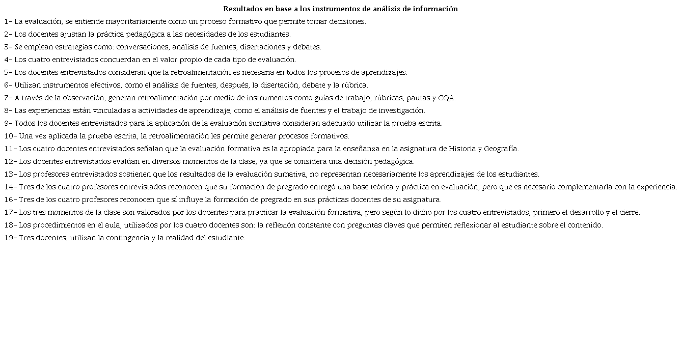 - Existen diversos instrumentos elegidos considerados efectivos; entre los docentes entrevistados, dos señalan utilizar el análisis de fuentes, después la disertación, debate y la rúbrica. En relación a las experiencias efectivas de los profesores de Historia y Geografía participantes en la presente investigación, se lograron las siguientes conclusiones: