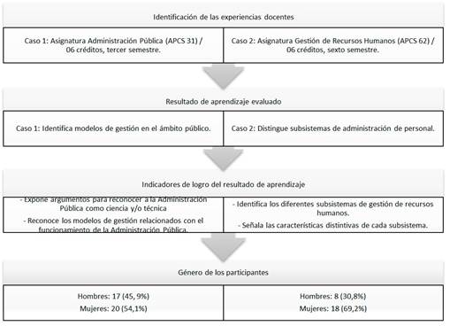 En el contexto institucional descrito anteriormente, nuestra experiencia piloto en el uso de organizadores gráficos y narrativas transmedia para la evaluación de resultados de aprendizaje en estudiantes universitarios de pregrado, se desarrolló en dos asignaturas ubicadas respectivamente en el tercer y sexto semestre de la malla curricular del plan de estudios de la carrera de Administración Pública, de la Universidad de Antofagasta en Chile. El perfil de egreso del Administrador Público señala que: