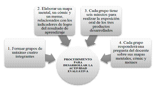 La actividad docente fue desarrollada según el procedimiento expuesto en la Figura 2, para que los estudiantes elaboraran sus mapas mentales, cómics y memes, relacionados con los respectivos resultados de aprendizaje e indicadores de logro de cada asignatura.