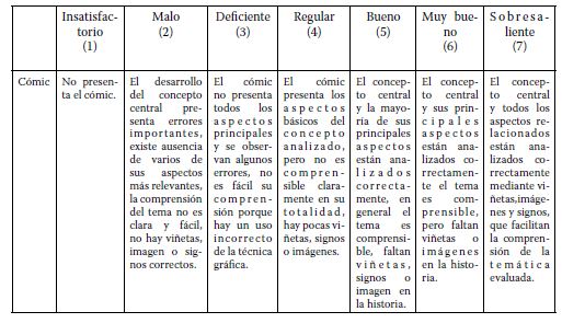 También, el cómic con propósitos educativos puede considerar su uso como instrumento de evaluación de RA según Onieva (2015), siendo recomendable establecer claramente: los aprendizajes a demostrar, los criterios de evaluación y los instrumentos de recogida de la información, entre otros aspectos. Además, es relevante la investigación previa que el estudiante debe realizar para preparar el cómic, así como aquellos aspectos de la creación artística del mismo, tales como los personajes, el guion argumental para el desarrollo de las viñetas, etc.