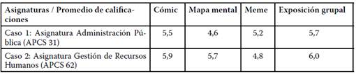 La Tabla 2, expone el promedio de calificaciones obtenidas en cada asignatura, según el tipo de organizador gráfico y exposición grupal, observándose que en ambas experiencias piloto los mejores resultados alcanzados se concentran entre los parámetros bueno (5) y muy bueno (6), para lo relativo a los Cómics y la Exposición oral desarrollados por parte de los y las estudiantes de ambas asignaturas.
