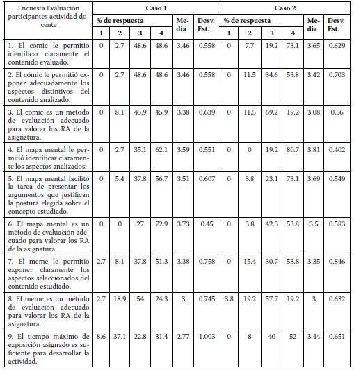 También, con el propósito de conocer la valoración de los estudiantes sobre la experiencia docente desarrollada, se elaboró un cuestionario ad hoc considerando una escala Likert con cuatro alternativas de respuesta, para valorar un total de 11 afirmaciones incluidas en el instrumento, relacionadas con cuatro tópicos: cómic, mapa mental, memes y trabajo grupal. En complemento a la evaluación cuantitativa, el instrumento incluye además un espacio para que los estudiantes voluntariamente formulen comentarios cualitativos sobre la actividad evaluativa desarrollada.