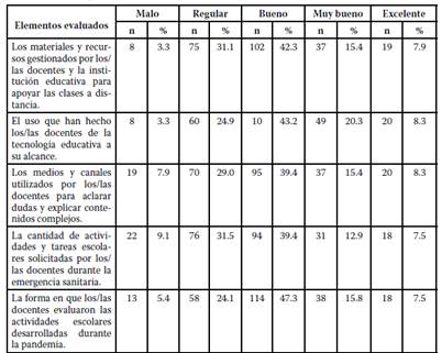 Evaluación del apoyo recibido. En esta categoría consideramos la evaluación del apoyo recibido de parte de los/las docentes y de las instituciones escolares. Con respecto al soporte brindado por los primeros, el 78.2% de los padres de familia lo consideró adecuado y el 16.3% como regular o intermitente y un 5.4% lo calificó como pésimo o inexistente. En el caso del apoyo institucional, el 60.2% lo consideró bueno o excelente, el 28.6% como regular y un 11.2% como malo o pésimo. Particularmente, sobre las acciones institucionales emprendidas para apoyar a los/las estudiantes en el tránsito hacia la modalidad a distancia, los padres señalaron en mayor medida la gestión de materiales digitalizados para los/las estudiantes (41.5%), la elaboración de guías para orientar el trabajo del colectivo docente durante la emergencia sanitaria (35.2%) y la habilitación de software y plataformas virtuales para la continuidad de las clases (20.3%), y, en menor medida, mencionaron la oferta de cursos o capacitaciones a los padres de familia (9.1%) y el otorgamiento de dispositivos tecnológicos para apoyar el aprendizaje desde casa a quienes lo requerían (3.3%). No obstante, es preciso señalar que un 21.5% reportó no haber recibido ningún tipo de apoyo por parte de la institución escolar. Finalmente, se les pidió a los padres de familia que evaluaran, bajo una escala ordinal (de malo a excelente), algunos aspectos relacionados con la estrategia de enseñanza a distancia. La tabla 3 muestra tales resultados: