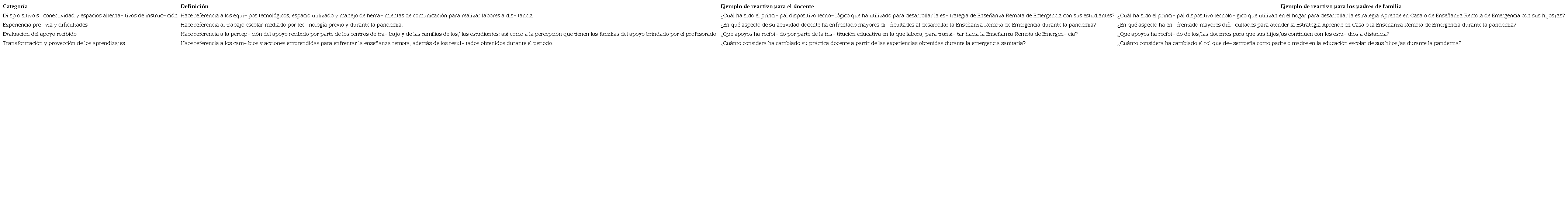 La tabla 1 muestra las categorías, sus definiciones y algunos ejemplos, tanto para docentes como para padres de familia.