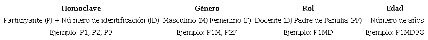 Para el abordaje cualitativo, se procedió en primer lugar a la identificación de las unidades temáticas para el análisis, y en este sentido fueron seleccionados fragmentos de respuestas en formato libre de profesores y padres de familia, paralelamente se realizó la elaboración de códigos. En la Tabla 2 se muestran los códigos asignados según las características de género, rol y edad de los participantes.