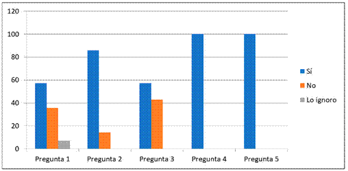 Como se indicó en el apartado metodológico, la encuesta aplicada constaba de seis focos temáticos. En la Tabla 2 se presentan las preguntas cerradas de dicho instrumento y, en el Figura 1, las respuestas de los informantes a estas interrogantes.