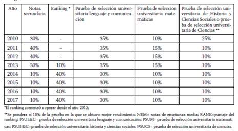 La importancia asignada (ponderación) a las distintas pruebas y a las NEM es definida por cada universidad, para cada una de sus carreras, a partir de una ponderación mínima de 20% de las NEM establecida por el Consejo de Rectores (Meneses y Toro, 2012).