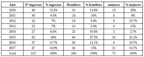 El estudio incluyó a 315 estudiantes con 22.1 (dt.=2.9) años de edad que ingresaron a FIPEF los años 2010; 2011; 2012; 2013; 2014; 2015; 2016 y 2017.