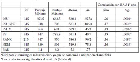 Para el análisis de correlación se utilizó el coeficiente de correlación de Rho Spearman (p=.05), y en el análisis descriptivo se utilizó el valor de la media (Media) y la desviación típica (dt.) de cada variable. Las variables de estudio consideradas fueron los resultados de la PSU, considerando los puntajes obtenidos en la PSUL&C, PSUM, PP, RANK y la media de las calificaciones (escala de 1.0 a 7.0) de los últimos 4 años de formación secundaria (NEM). Se correlacionó cada una de las variables antes descritas con las medias de las calificaciones del primer año académico universitario (RAU). Para el procesamiento de la información se utilizó el programa estadístico SPSS en su versión 18.0.