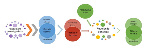 A ciência para Kuhn passa por um período pré-paradigmático, no qual há escolas competindo por um conhecimento ‘consensual’. Ela progride, então, para um período de ciência normal, caracterizado pela resolução de quebra-cabeças imbuídos na confiança depositada em um paradigma estabelecido, o desencorajamento às iniciativas revolucionárias e a inexistência de competições em nível de controversas profundas. O paradigma mantém, com seu conjunto de exemplares, por exemplo, o suficiente para definir e resolver, em princípio, estes quebra-cabeças; a solução deles, com efeito, é um empreendimento cumulativo. “Abandonar o paradigma” então aceito seria, conforme Kuhn (2011a), “deixar de praticar a ciência que este define” (p. 56); mas isso pode ocorrer quando aparecem anomalias graves que enfraquecem o paradigma vigente e que levam a crises.