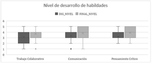 Con respecto a las tres habilidades, en la Figura 1 se puede apreciar la variación de cada una de ellas, considerando que fue pensamiento crítico la que mostró mejores resultados.