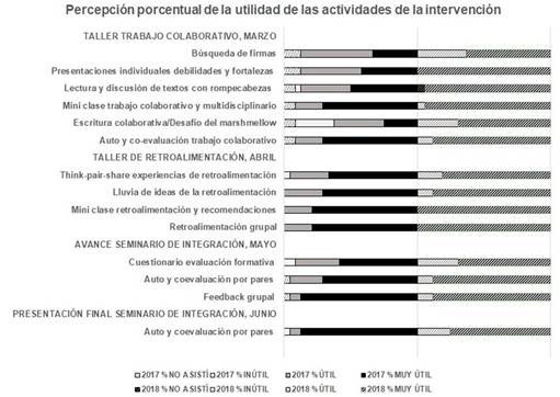 La percepción de la utilidad de cada una de las actividades es muy positiva. Solo se desprende el replantear la actividad de trabajo escritura colaborativa con plumón de la intervención el 2017, que es percibida como inútil por un número importante de participantes. Por lo tanto, como se indicó en la sección Método, el 2018 se reemplazó por el desafío del marshmellow, que fue considerada por la mayoría como muy útil. Destaca la utilidad percibida de las clases breves de trabajo colaborativo y de retroalimentación, el ejercicio de retroalimentación durante el taller, el proceso de retroalimentación en el avance. La percepción de utilidad mejoró el 2018, año en el cual se reorganizaron las actividades en respuesta a los resultados del 2017.