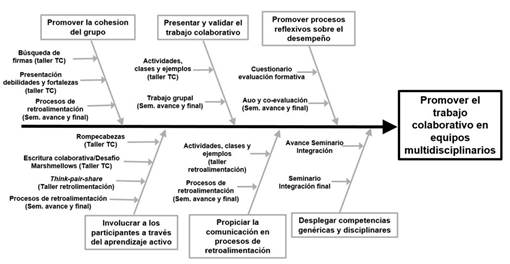 En síntesis, cada una de las actividades, tributa a uno de los aspectos que consideramos claves para promover el trabajo colaborativo: 1) Promover la cohesión del grupo, 2) Involucrar a través del aprendizaje activo, 3) Presentar y validar TC, 4) Propiciar la comunicación en procesos de retroalimentación, 5) Promover procesos reflexivos sobre el desempeño y desplegar competencias genéricas y disciplinares en contextos reales; los cuales se resumen en el diagrama de Ishikawa de la Figura 4.