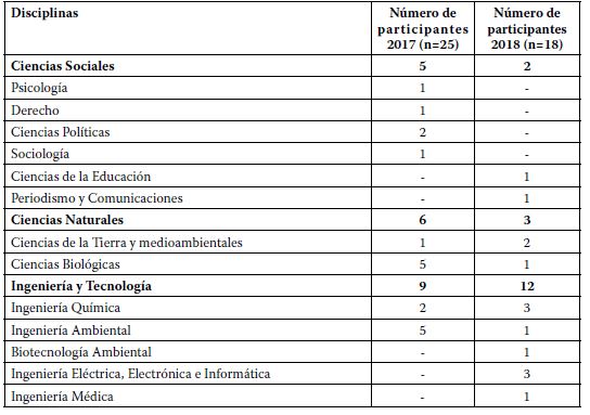 El diseño del estudio es de carácter pre-experimental, cuantitativo, de alcance descriptivo. Participaron 43 estudiantes universitarios, constituyendo el total de alumnos que cursaban la asignatura obligatoria el primer trimestre del año 2017 y 2018. El 2017 participaron 25 estudiantes universitarios, 10 (40%) hombres y 15 (60%) mujeres, con edades entre los 24 y 55 años (M=31,4; DE=7,2), 2 de ellos extranjeros. El 2018 participaron 18 estudiantes universitarios, 8 (44%) hombres y 10 (56%) mujeres, con edades entre los 26 y 45 años (M=32,5; DE=5,8), 7 de ellos extranjeros. Los estudiantes provenían de 22 programas de pregrado diferentes, los cuales se presentan clasificados por disciplinas y subdisciplinas de acuerdo a la Organización para la Cooperación y Desarrollo Económico (OCDE) en la Tabla 1.