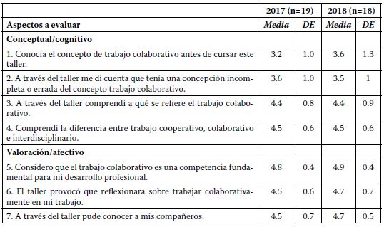 La percepción del estudiante del taller de trabajo colaborativo se presenta en la Tabla 2.