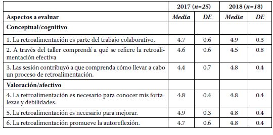 La percepción del estudiante del taller de retroalimentación se presenta en la Tabla 3. Un 100% de los participantes de ambas cohortes contestaron el instrumento.