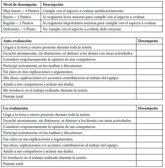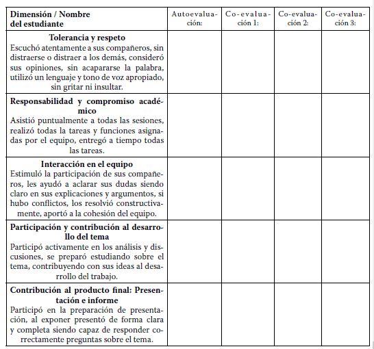 Finalmente, los estudiantes se autoevaluaron y co-evaluaron a los compañeros del equipo mediante una escala de estimación conceptual (Anexo I). Además, se obtuvo la percepción del estudiante del taller por auto-reporte a través de una escala de apreciación de tipo Likert.