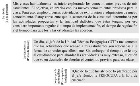 Aproximaciones al PCK personal del profesorado, han sido capturados, principalmente, desde una perspectiva declarativa, usando el cuestionario Content Representation (CoRe) de Loughran et al. (2004) y mapeando las relaciones entre los componentes del PCK (Aydin y Boz, 2013; Park y Chen, 2012; Ravanal y López-Cortés, 2016; Suh y Park, 2017). Esto permitiría obtener una representación del PCK personal del profesor, desde ahí, los equipos pueden planear actividades de desarrollo orientadas a su complejización. En adición, proponemos un trabajo de análisis de casos acerca de la enseñanza de la biología, que reconozca tres elementos: (a) descripción amplia y contextualizada de una situación de enseñanza que sitúa al profesor en un primer plano, protagonista, (b) proponer un dilema o una controversia expresada como idea de un interlocutor distinto al profesor que tensiona la situación de enseñanza descrita y, (c) proponer una pregunta que permita explicitar aquello que pueda intranquilizar al profesor, ya sea, por la situación en la que él está inscrito o por la idea planteada por el interlocutor (Figura 5).