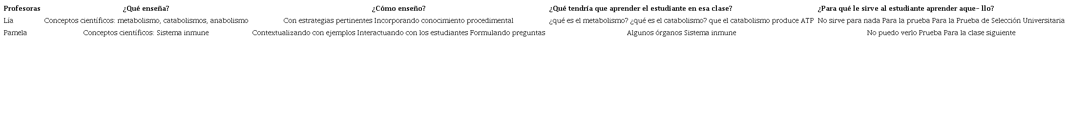 La idea de transitar de un PCK personal a un PCK personal puesto en acción (PCK personal-acción), es un trabajo que a la fecha estamos iniciando. Aun así, con dos profesoras de Biología experimentadas partimos el trabajo de análisis de sus clases, orientado por cuatro preguntas, que fueron: ¿qué enseño? ¿cómo enseño? ¿qué tendría que aprender el estudiante en esa clase? ¿para qué le sirve al estudiante aprender aquello? Los resultados de este momento los resumimos en la Tabla 1.