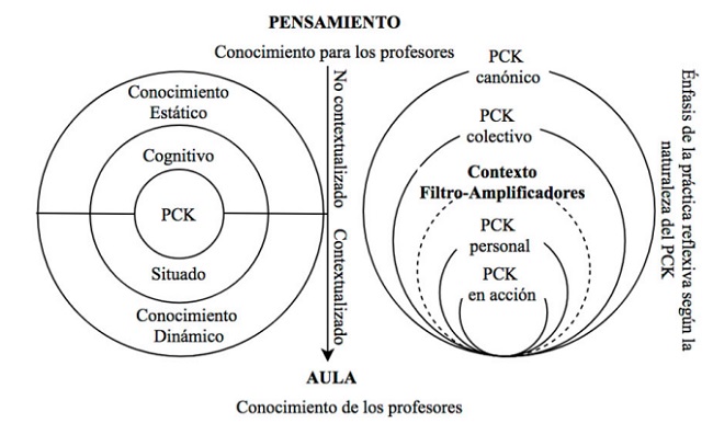 Los últimos estudios acerca del PCK de profesores de ciencias (Berry et al., 2015; Cha y Hume, 2019), reconocen dos perspectivas de análisis para su estudio: una cognitiva y otra situada. La perspectiva cognitiva, alude a todos los estudios que lo encuadran como un conocimiento prescriptivo y estático para los profesores. En tanto la perspectiva situada, lo describe como aquel conocimiento que las/los profesores usan y logran explicitar en el acto de enseñar, eso significa, reconocerlo como un constructo dinámico y con la capacidad de interactuar con otros tipos de conocimiento en contexto. Según Carlson y Daehler (2019) el PCK puede describirse en tres tipos, que son: