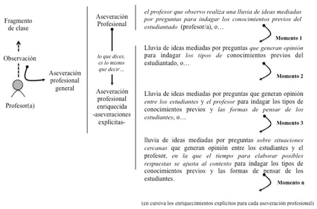 En ese marco, las aseveraciones que surgen de la reflexión y su ulterior profundización para externalizar los implícitos, a nuestro modo de ver, debiese constituir un eje de la práctica reflexiva, favoreciendo el desarrollo del pensamiento de las/los profesores a través del lenguaje profesional en contexto, como una alternativa de aprendizaje profesional (Figura 3). Es decir, la práctica reflexiva debe propender a la evolución de los modelos descriptivos, explicativos e interpretativos del profesorado, a través del lenguaje como la expresión de aseveraciones contextualizadas y multidimensionales, evitando de esa forma, que las generalizaciones y el carácter implícitos de las cosas que se dicen, alcancen un estatus de alta comprensión de las particularidades de la enseñanza, cuando a decir verdad, aun falta profundizar en ello, a partir de aseveraciones explícitas que reconozcan sujetos, espacios, tiempo, contextos, condiciones, factores, variables, entre otras, para hacer de ellas buenas descripciones para mayores comprensiones profesionales. La relación analítica sobre las aseveraciones profesionales y el sentido profundo de lo que se desean comunicar profesionalmente, es un asunto complejo que requiere de ayudas, andamios para su explicitación y comprensión.