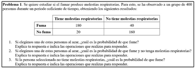 Se elaboró un cuestionario con dos problemas contextualizados, cada uno de ellos con tres ítems relacionados con el cálculo de probabilidades en tablas de contingencia 2x2. El problema 1 (ver Figura 1) se adaptó del propuesto por Estepa (1993) y presenta la relación entre dos variables dicotómicas (“Fuma” o “No fuma” y “Tiene molestias respiratorias” o “No tiene molestias respiratorias”). El seleccionar una persona al azar consiste en un fenómeno compuesto por dos experimentos aleatorios: el primero con dos resultados posibles: “Tiene molestias respiratorias” (evento A) y su complemento, “No tiene molestias respiratorias” (A’); y el segundo con otros dos resultados: “Fuma” (evento B) y su complemento, “No fuma” (B’).