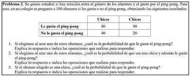 El problema 2 (ver Figura 2), es una adaptación del propuesto por Contreras et al. (2010), y muestra la relación entre dos variables dicotómicas (“Chico” o “Chica” y “Le gusta el ping-pong” o “No le gusta el ping-pong”). Asimismo, al seleccionar una persona al azar se realiza un experimento aleatorio compuesto por dos más simples: el primero con dos resultados posibles: “Ser chico” (evento A) y su complemento, “Ser chica” (A’); y el segundo con otros dos resultados: “Le gusta el ping-pong” (evento B) y su complemento, “No le gusta el ping-pong”
