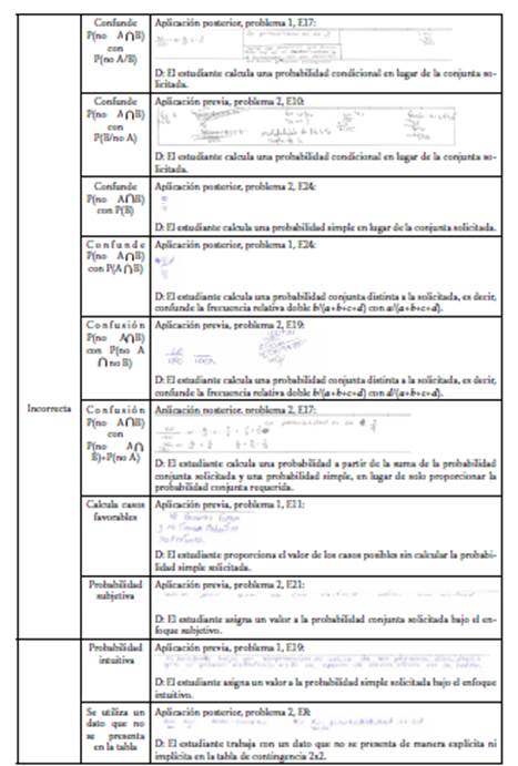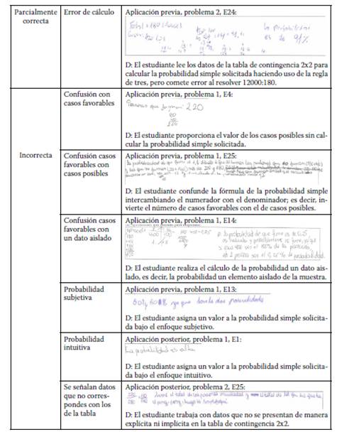 3. Incorrectas: cuando la respuesta es errada y se muestran confusiones entre probabilidades, o bien, se proporcionan probabilidades intuitivas o subjetivas (Batanero, 2005).