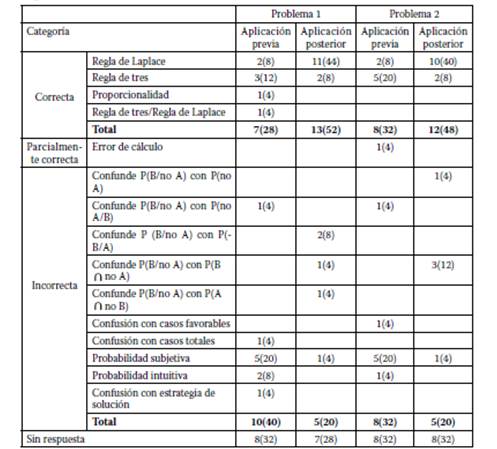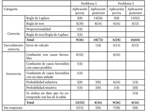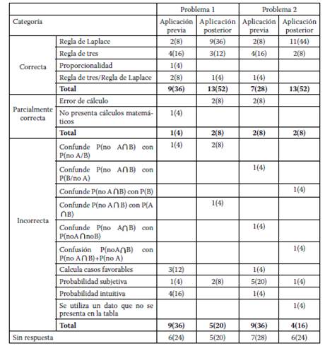 El análisis de los resultados nos permitió observar que, antes de la experiencia de aprendizaje, una gran cantidad de las respuestas se clasifican como incorrectas o sin respuesta (P1: 64%, P2: 64%), siendo los conflictos de mayor frecuencia: a) confusión con casos favorables (P1: 32%, P2: 16%), y b) probabilidad bajo el enfoque subjetivo (P1: 8%, P2: 16%). Esto refleja que una mayoría de los estudiantes confunden la probabilidad con el número de casos o aún poseen concepciones incorrectas sobre ella, por ejemplo, el sesgo de probabilidad subjetiva o la probabilidad intuitiva. Por otro lado, en las respuestas correctas se destaca el uso de la regla de tres como estrategia de solución (P1: 20%, P2: 16%), es decir, los estudiantes calculan el porcentaje desde los casos favorables con respecto al total que consideran el 100%. Esto refleja una preferencia a la práctica menos relacionada con los significados de la probabilidad, esperable debido a que los participantes no han abordado la probabilidad en tablas de doble entrada.