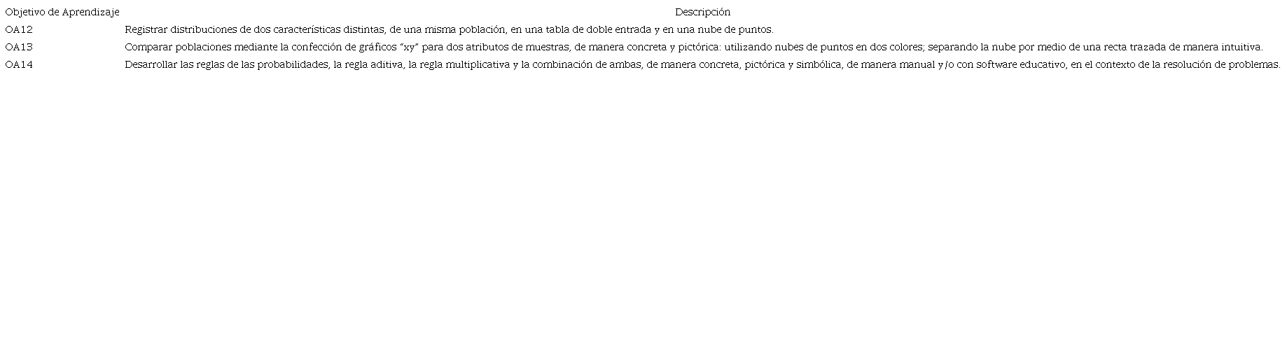 Respecto a las tablas de contingencia en el currículo de Estadística y Probabilidad de educación secundaria, Cañadas et al. (2016) y Awuah y Ogbonnaya (2020) expresan que posee una estrecha relación con los contenidos que presenta; por ejemplo, la idea de eventos dependientes e independientes, frecuencia, muestra, la probabilidad de distintos eventos, los principios de la probabilidad, el razonamiento crítico y la resolución de problemas. En Chile, en lo que corresponde a la educación media, la tabla de contingencia y el cálculo de probabilidades se trabajan de manera conjunta en primer año medio. En la Tabla 1 se presentan los objetivos de aprendizaje (OA) relacionados, de manera explica o implícita, con estos contenidos.