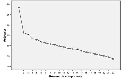La aplicación del AFE permitió determinar el número de factores de acuerdo a cómo tienden a agruparse las 22 variables o ítems.