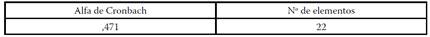 En este apartado, se determinó el coeficiente Alfa de Cronbach considerando las respuestas de la totalidad de los indicadores del instrumento. En función de la consistencia interna y fiabilidad, arrojó que se encuentra por debajo de lo aceptable como criterio general en análisis estadístico: