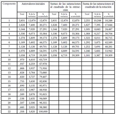Se utiliza el método de rotación ortogonal Varimax para la rotación de ejes y minimizar el número de variables que tienen altos valores en cada factor. En la Tabla 3 se evidencia que con todos los factores se llega al 100% de la varianza, sin embargo, solo los primeros nueve factores que corresponden a un autovalor superior a 1, son los que se deben retener para el análisis. Una expectativa realista en términos de la varianza explicada por los factores, según Henson y Roberts (2006) citado en Morales (2013), es del 52,03%, otros autores sugieren altas expectativas en torno al 75%. En la Tabla 3 los nueve factores recogen casi el 60% de la varianza total explicada.
